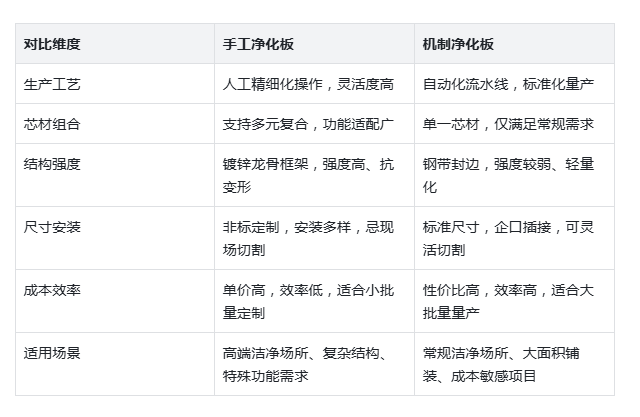 手工净化板与机制净化板是洁净工程领域的常用建材,二者在生产逻辑、性能特性及应用场景上的差异源于生产工艺的本质不同——手工板以“柔性定制”为核心优势,机制板以“标准化量产”为核心特点。以下从六大核心维度详细解析二者区别: