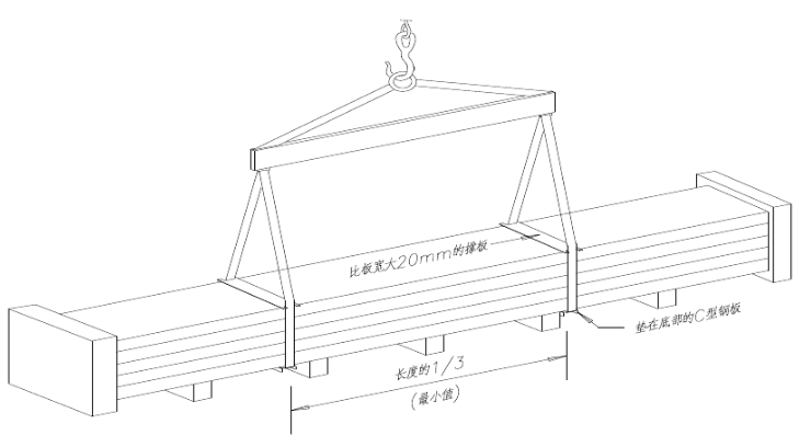 (1)成捆岩棉夹芯墙面板吊运,不能直接用吊钩和岩棉夹芯墙面板间形成三角形方式吊运,而必须使用吊杆,使吊带与岩棉夹芯墙面板和吊杆间垂直吊运,并应找好起吊平衡点后吊运。两起吊点之间的距离不应小于板长的1/3。要单捆起吊,小心轻放,不能将岩棉夹芯墙面板拖行.  如下图所示: