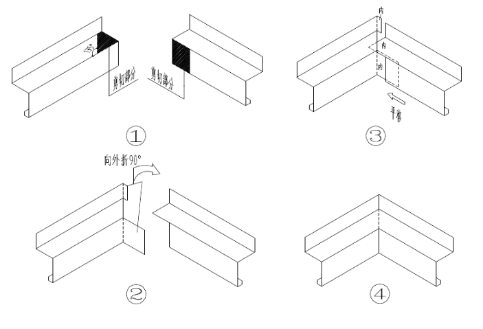 收边对应施工详图所注使用位置,对有需要二次加工的应提前剪角或折边,为了保护切边的涂层最好用剪刀裁剪。